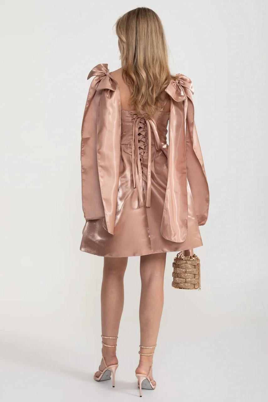 فستان قصير من الساتان بلون وردي فاتح مزين بفيونكات على الكتفين