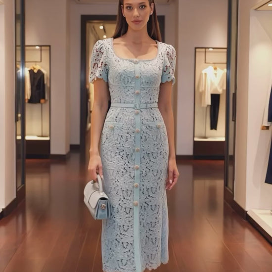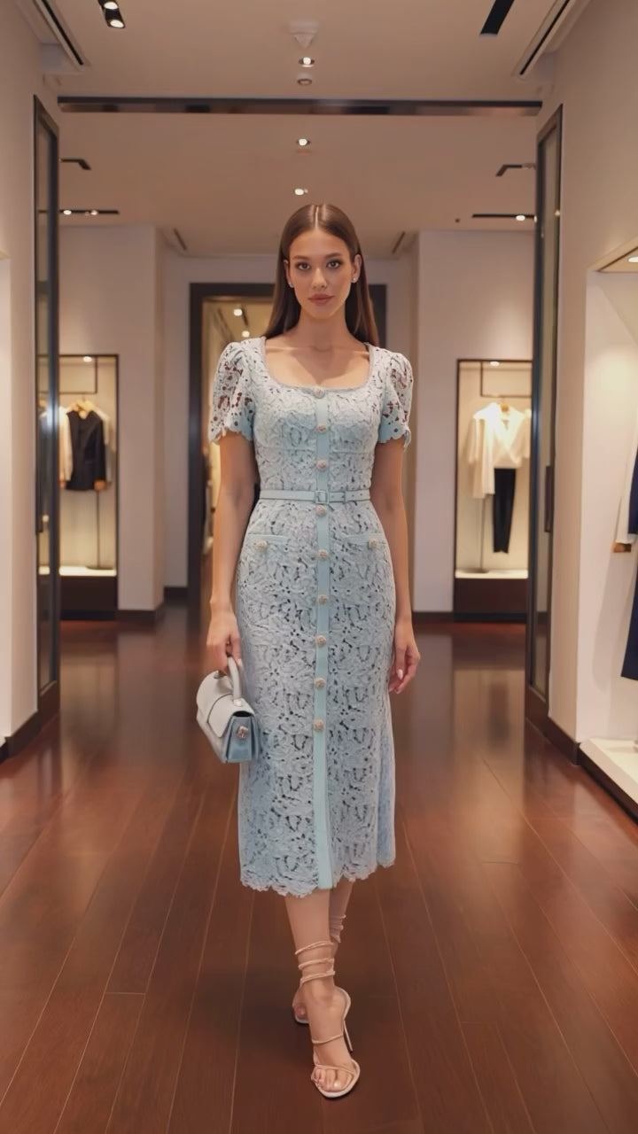 Elegant midi dress crafted from delicate lace with a fitted silhouette and short sleeves. A slim belt accentuates the waist, creating a refined and feminine look.