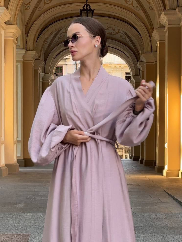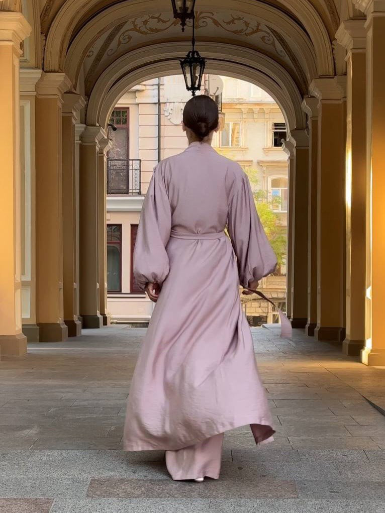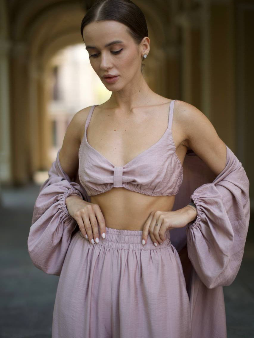 Elegant three-piece lounge set crafted from lightweight natural linen. Featuring flowing wide-leg trousers, a soft bralette, and a relaxed robe for effortless comfort and refined home elegance.