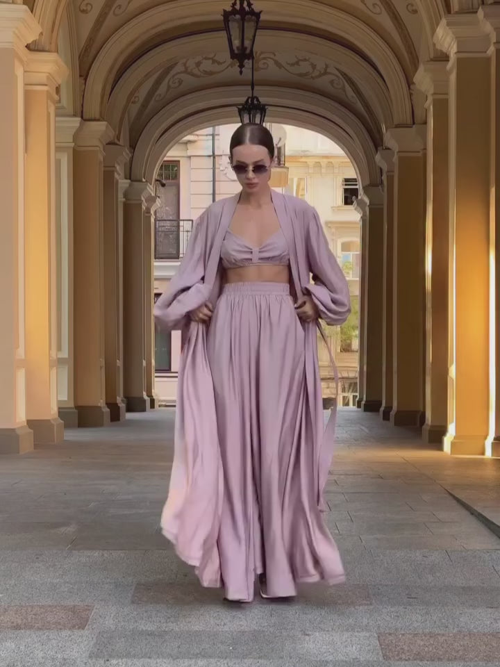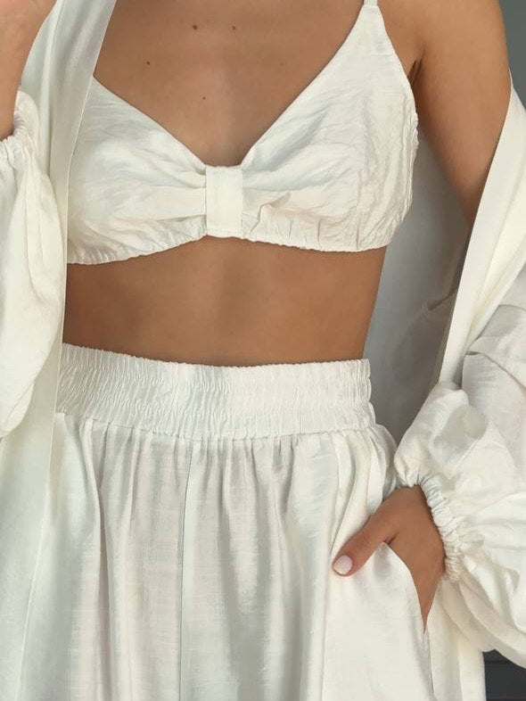 Elegant three-piece lounge set crafted from lightweight natural linen. Featuring flowing wide-leg trousers, a soft bralette, and a relaxed robe for effortless comfort and refined home elegance.
