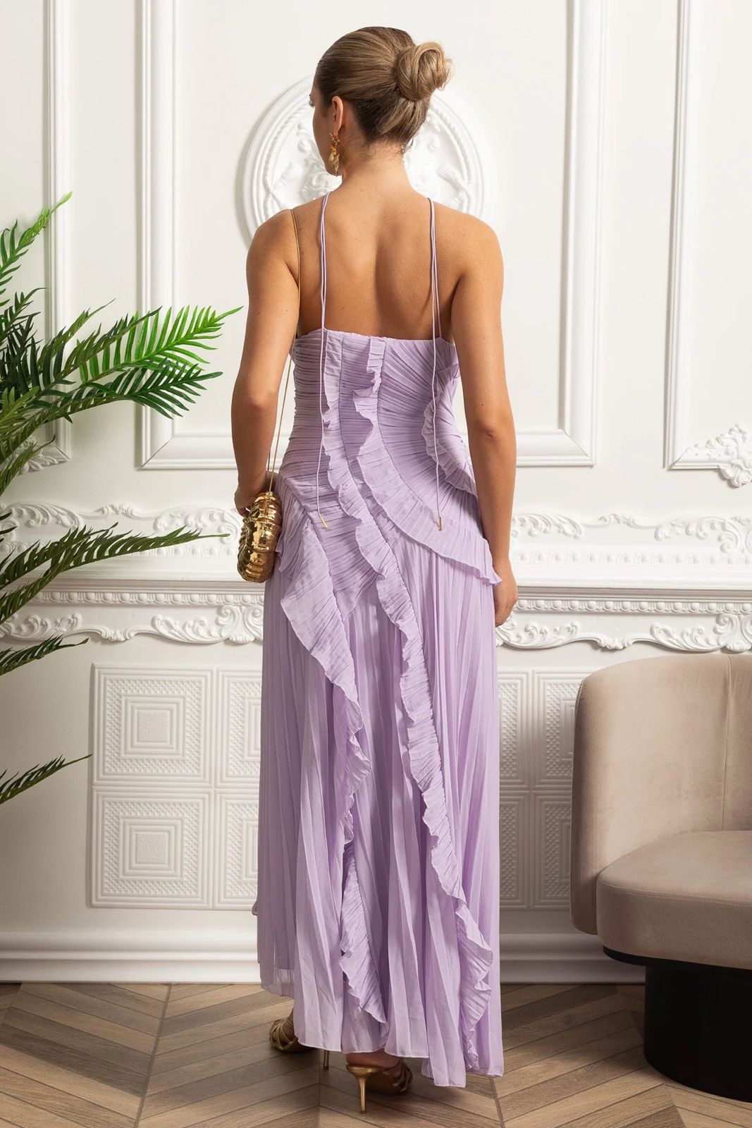 Скульптурна плісована шифонова сукня ніжного відтінку пильно-рожевого. Асиметричні волани каскадом спадають вздовж ліфа та спідниці, створюючи плавний рух та гарний текстурований силует. Ніжний перехресний виріз горловини додає сучасного, жіночного штриха. Ідеально підходить для вечірніх заходів, святкувань або елегантних літніх подій.